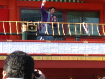 氏子総代、官公庁特別崇敬者による桜組の豆まきに続いて、毎年一番盛り上がる、芸能人も登場する花組。今年は誰だろう、・・・ん、なんか見覚えがある、あれっ?三笠ベトナムの田中社長?・・・
