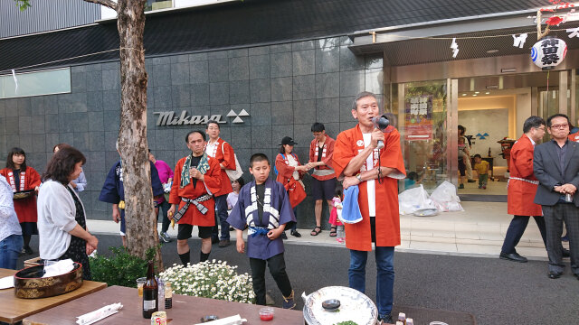 本社に近づくと、『三笠さん入って!』と声が掛かり、社員のU主任が前に飛び込んだと思った瞬間足が攣って2秒で外に飛び出し、傍らで自分の仲間に足を揉んで貰い、なんとか治して本社前では肩を入れていました。予定より15分ほど遅れて神輿が本社ビルに到着。京谷社長の陣頭指揮の下、有志の社員で準備万端の出迎えに対して神輿を向けて差し (その場所に対して、敬意を持って神輿を高く掲げ上げる事) 、会社前で休憩。先月号のメルマガで紹介されましたが、私は今回も拍子木を打たせて貰いました。